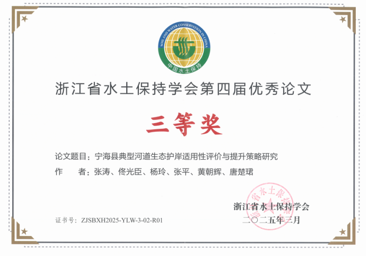 會議現(xiàn)場通報了2024年度生產建設項目水土保持方案優(yōu)秀單位、2024年度生產建設項目水土保持監(jiān)測優(yōu)秀單位,并為獲獎集體進行表彰。隨后,又現(xiàn)場表彰了浙江省水土保持學會第四屆優(yōu)秀論文評選結果。我院榮獲2024年度生產建設項目水土保持方案優(yōu)秀單位、2024年度生產建設項目水土保持監(jiān)測優(yōu)秀單位兩項集體榮譽,并且以論文《寧??h典型河道生態(tài)護岸適用性評價與提升策略研究》獲得浙江省水土保持學會第四屆優(yōu)秀論文三等獎。