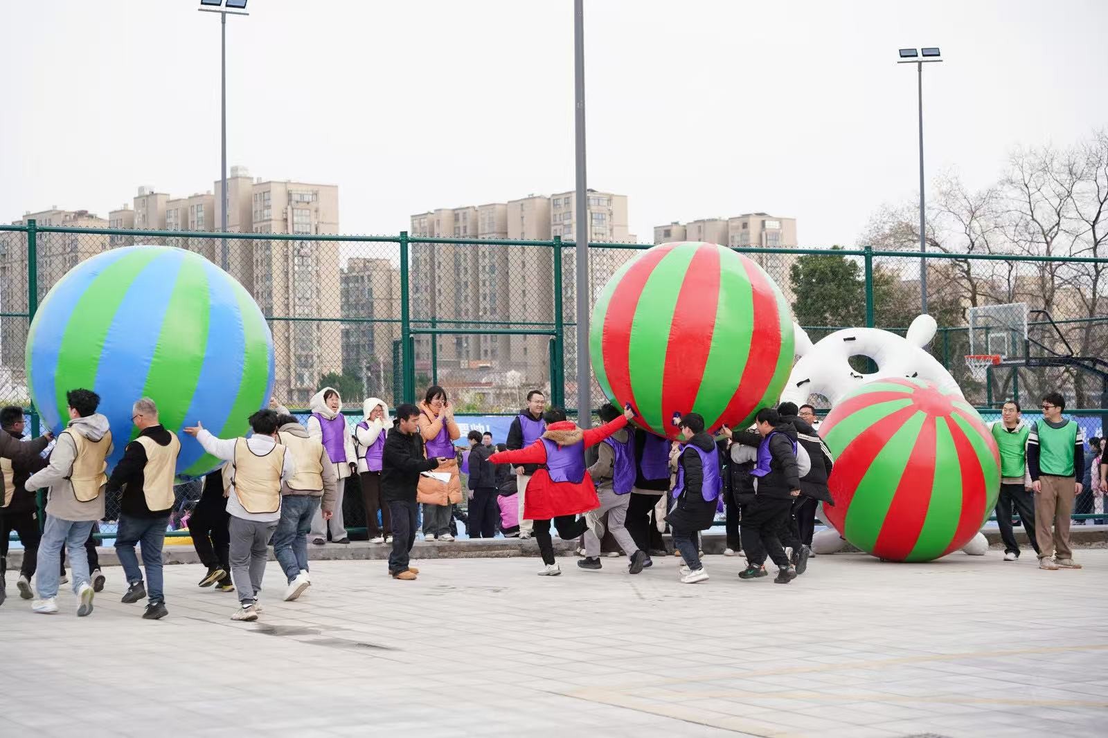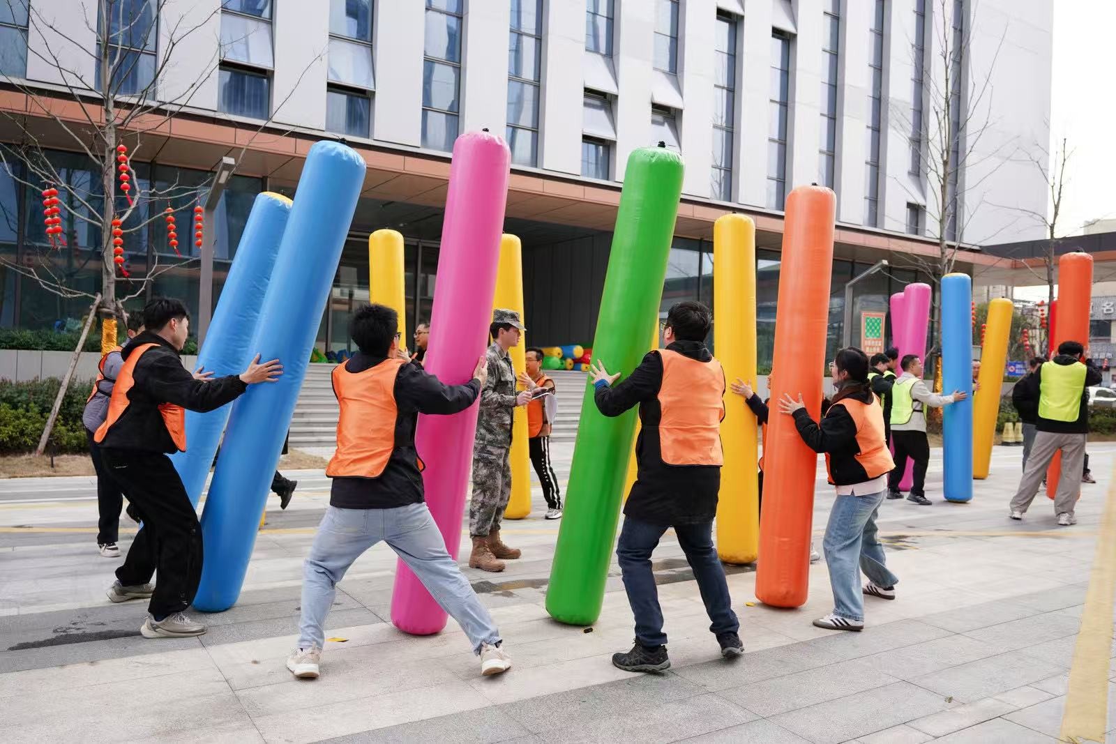 在“南水北調(diào)”項(xiàng)目中,隊(duì)員們手持PVC管接力運(yùn)水,5分鐘內(nèi)爭分奪秒,讓水流在管中傳遞涌向重點(diǎn),仿佛將團(tuán)隊(duì)的信任與責(zé)任匯聚成河。“龜兔賽跑”則讓隊(duì)員們化身可愛的“烏龜”和“兔子”,在賽道上你追我趕,妙趣橫生。“鴻運(yùn)亨通”需要8人共同托舉大球折返跑,大家步調(diào)一致,齊頭并進(jìn)。“一錘定音”環(huán)節(jié),隊(duì)員們揮動(dòng)充氣大錘敲破氣球,每一聲“砰”響都引來陣陣喝彩。