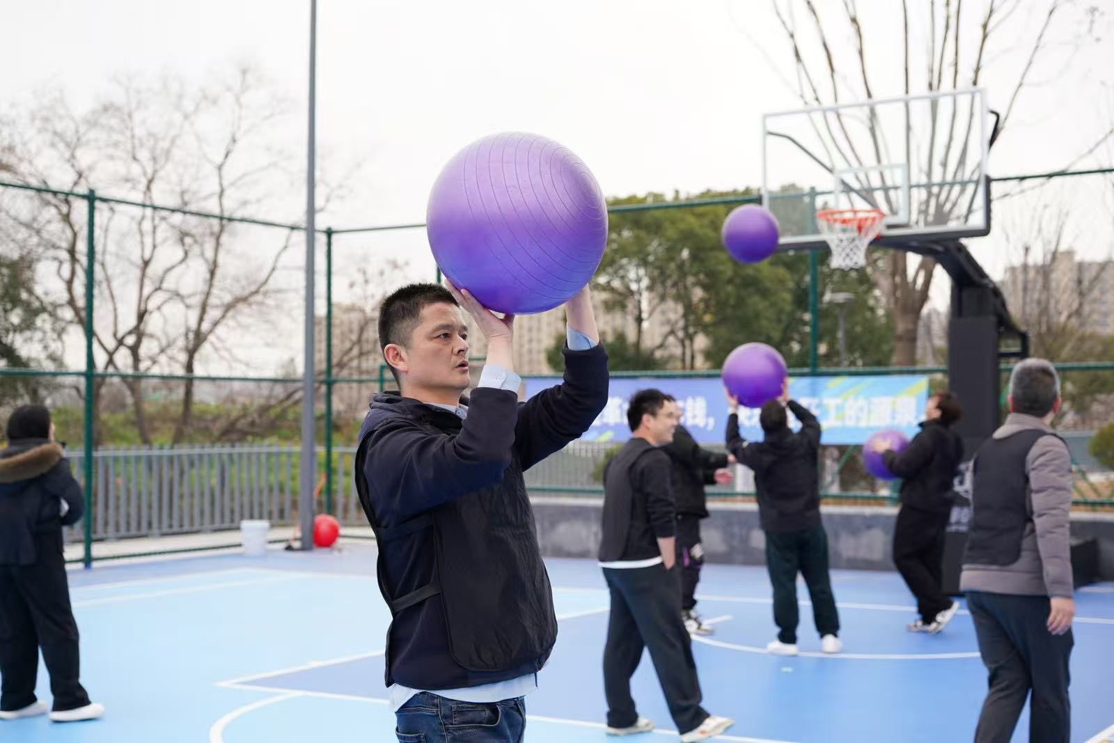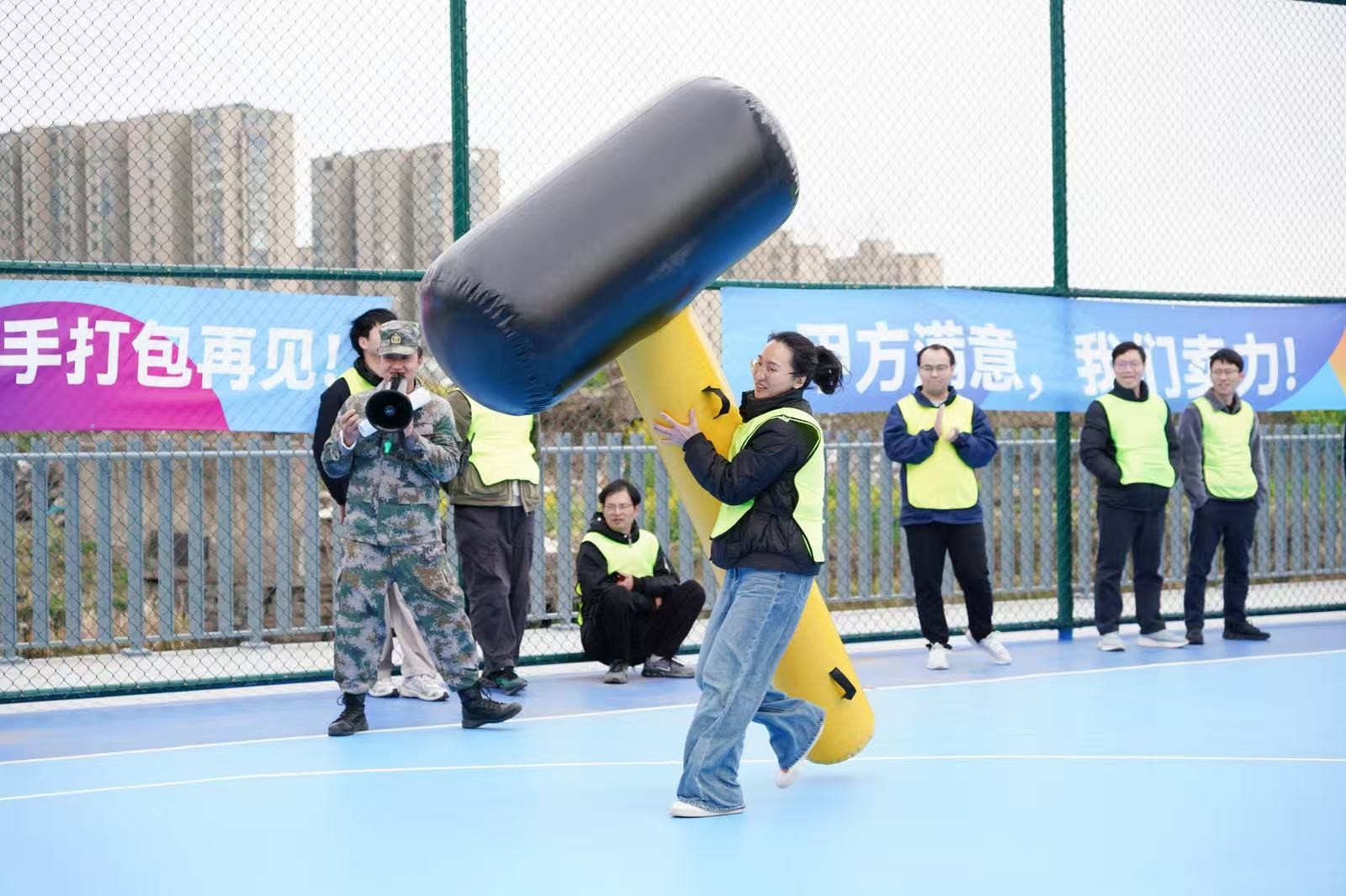“勇立潮頭”考驗(yàn)的是反應(yīng)與穩(wěn)定,隊(duì)員們圍成圓圈快速移動(dòng),同步接住充氣柱,1分鐘內(nèi)有效移動(dòng)次數(shù)不斷刷新。“超級NBA”中,大家用瑜伽球投籃,雖姿勢各異,但進(jìn)球瞬間的歡呼同樣熱烈。“乘風(fēng)破浪”要求隊(duì)員在充氣墊上接力鋪設(shè)充氣棒,讓體重不輕于75kg的“重量級”選手穩(wěn)坐墊上,隊(duì)友們默契配合,如乘風(fēng)破浪般前行。最后的“巨人腳步”由每隊(duì)兩名領(lǐng)隊(duì)腳穿巨型鞋蹼接力奔跑,滑稽的動(dòng)作引來全場笑聲不斷。